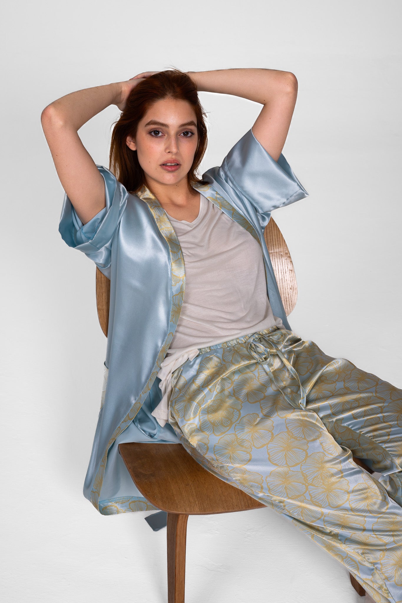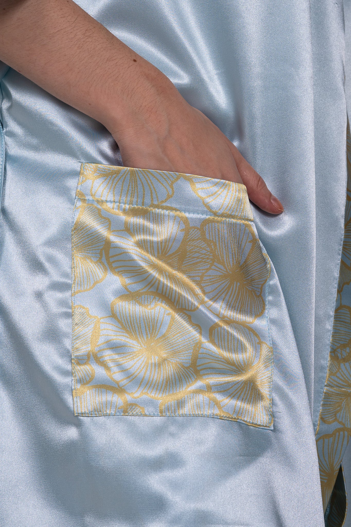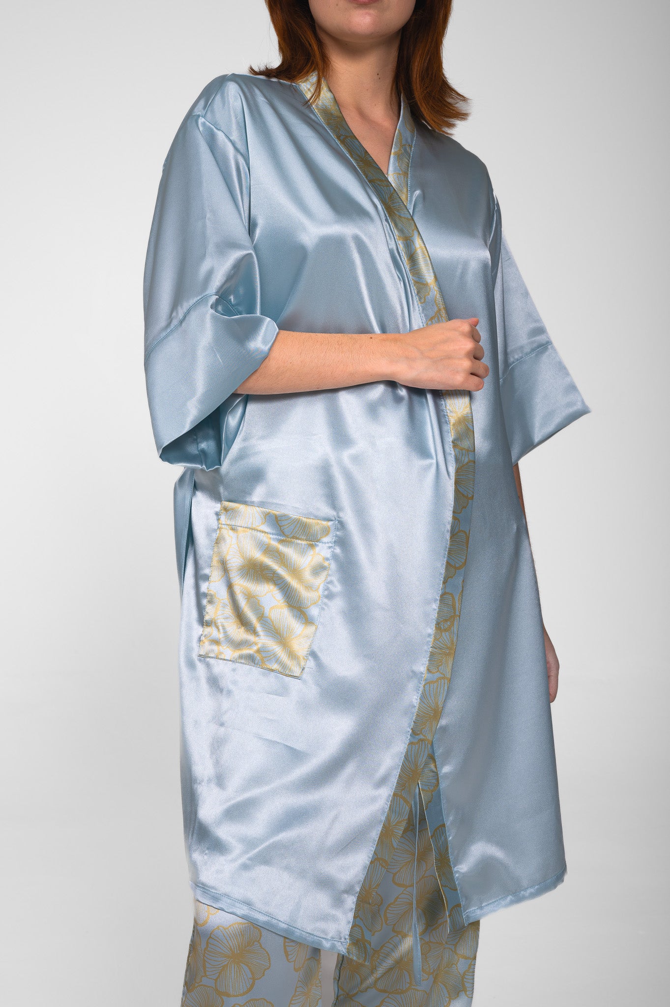 Bata Satinada en celeste con estampa flores amarillas- 100% Poliester
