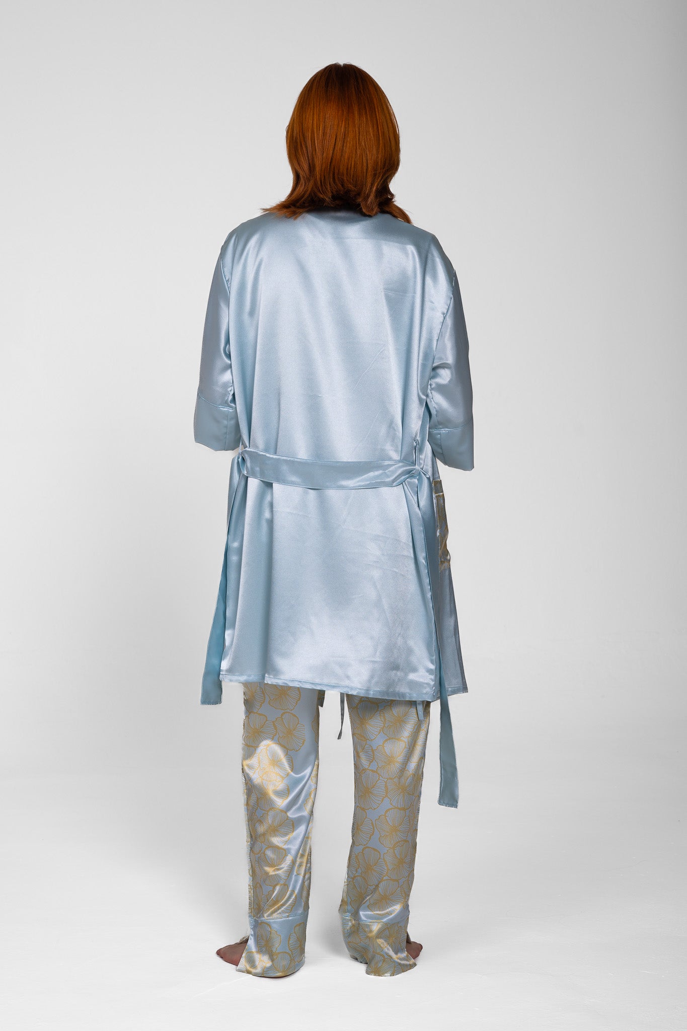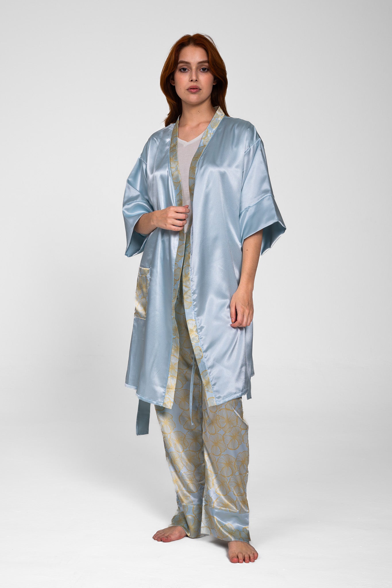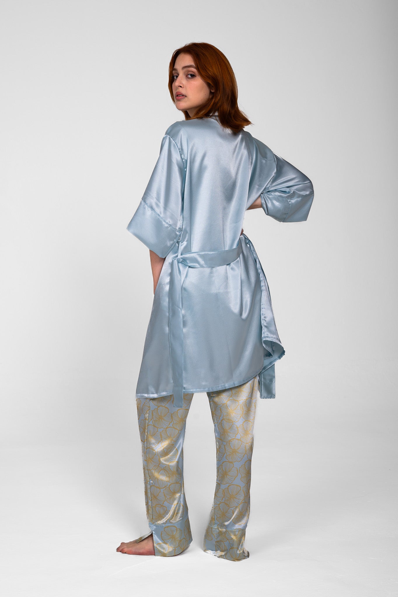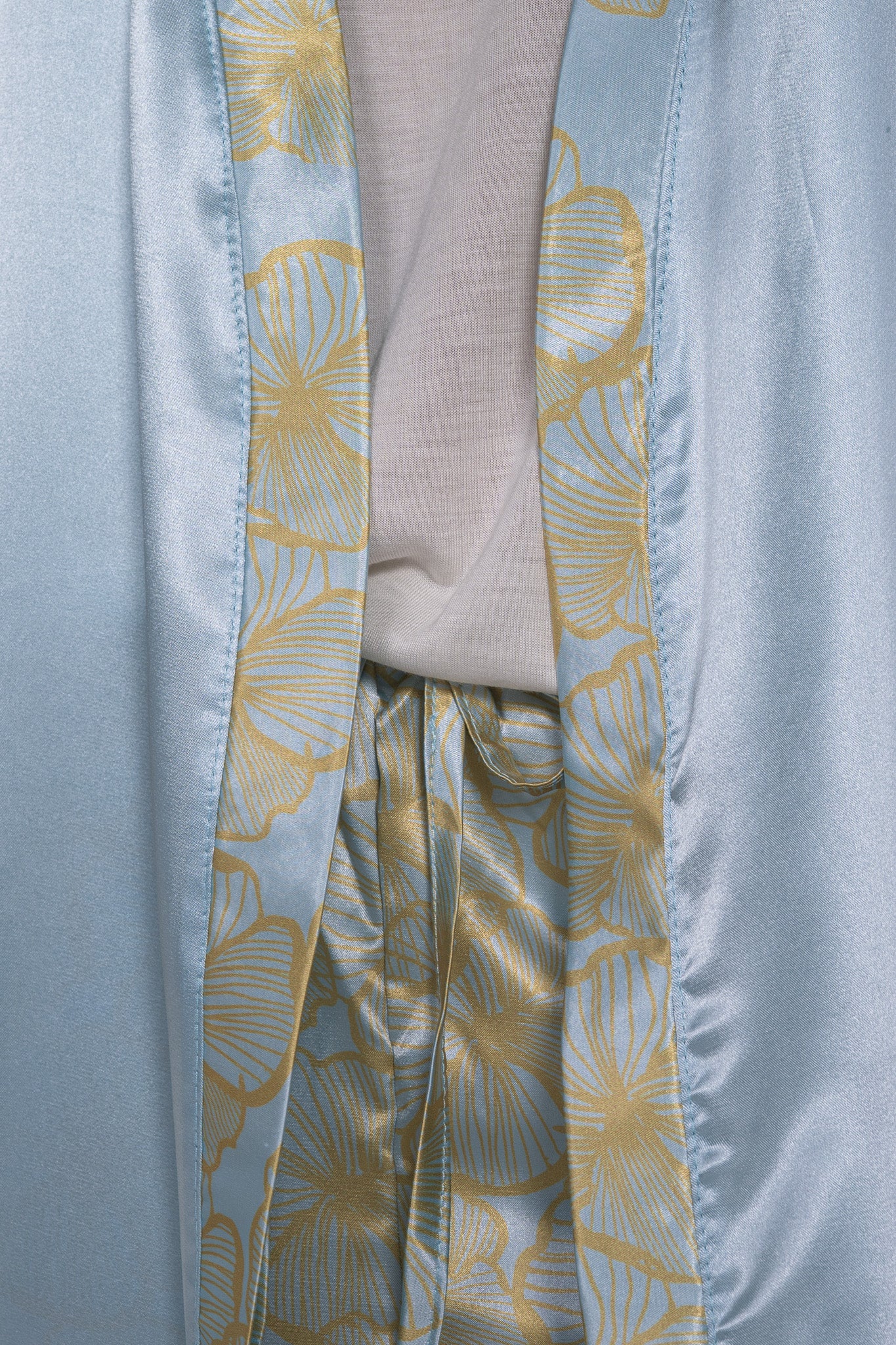 Bata Satinada en celeste con estampa flores amarillas- 100% Poliester