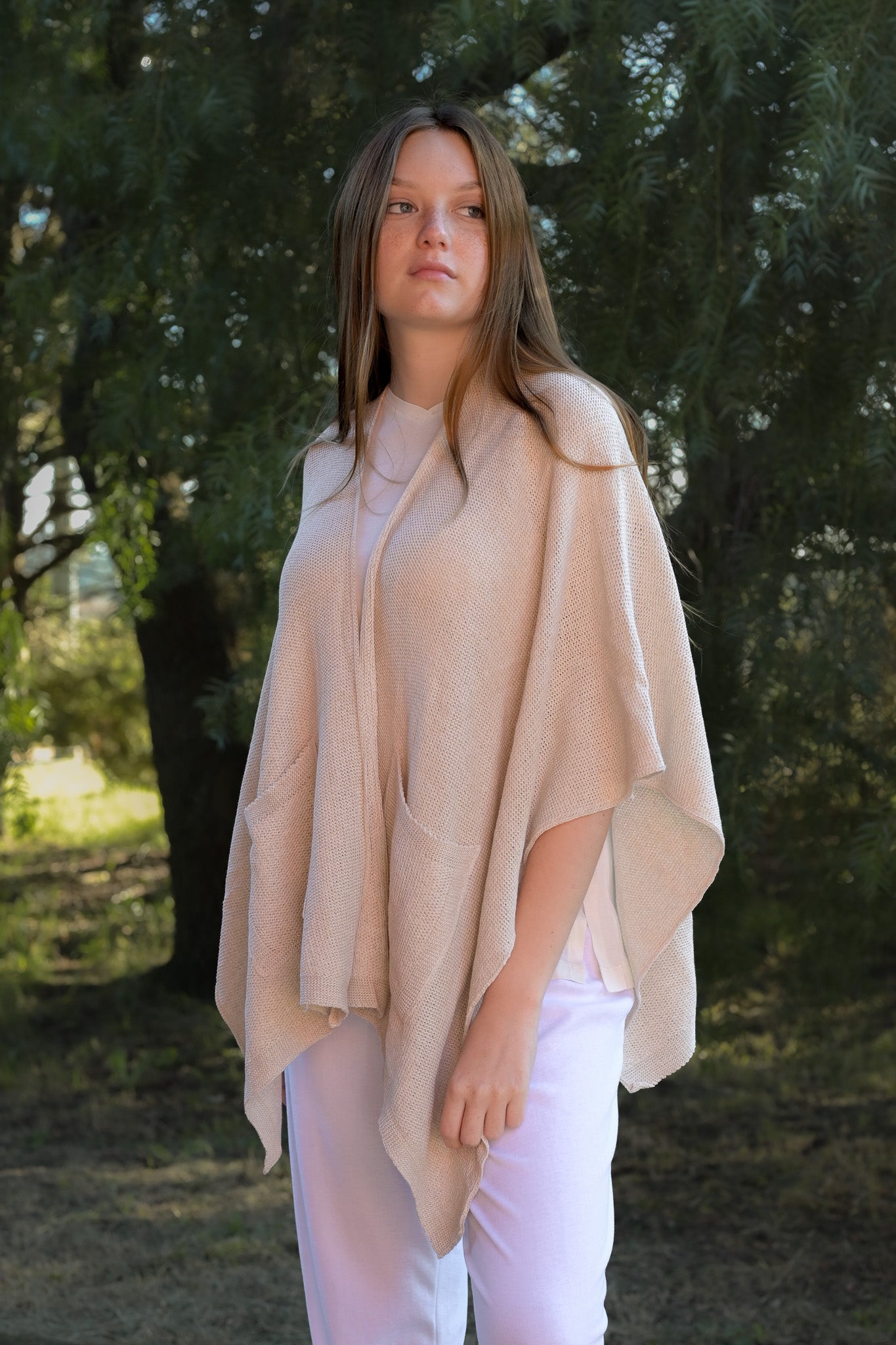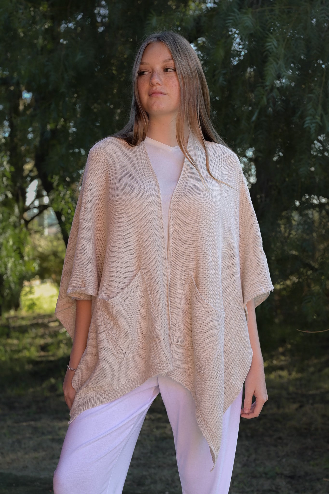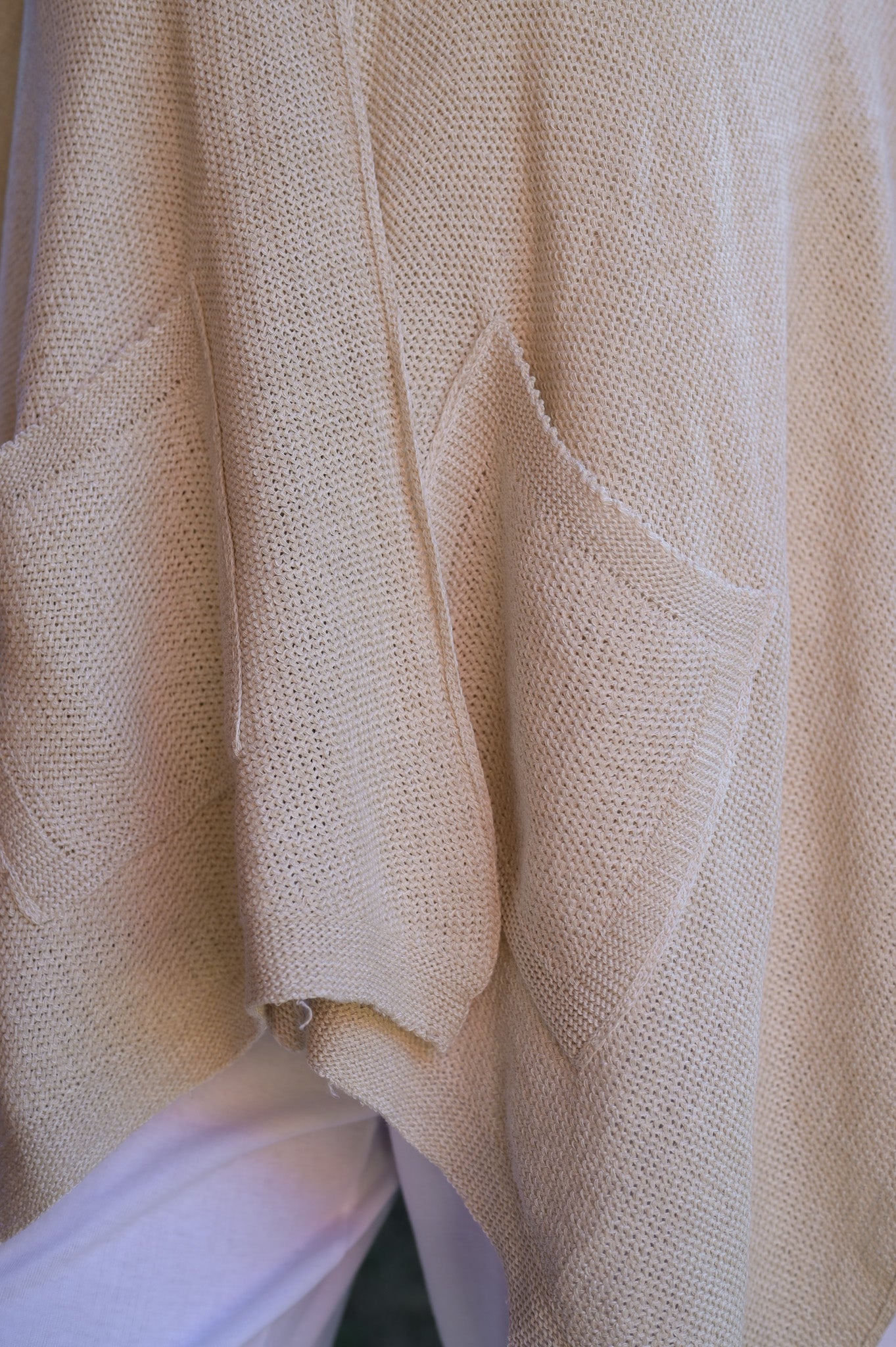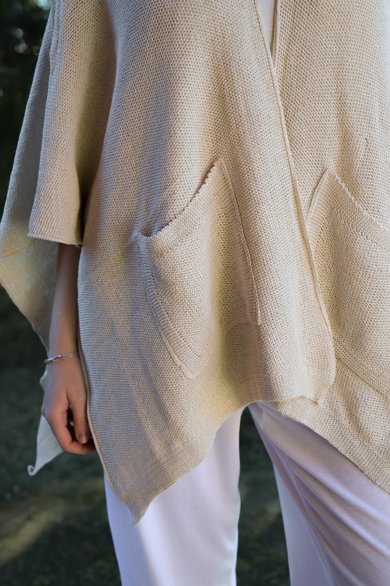 Ruanas de tejidas de cáñamo y algodón con bolsillos en sus delanteras. Abrigadas y cómodas para estar entre casa.